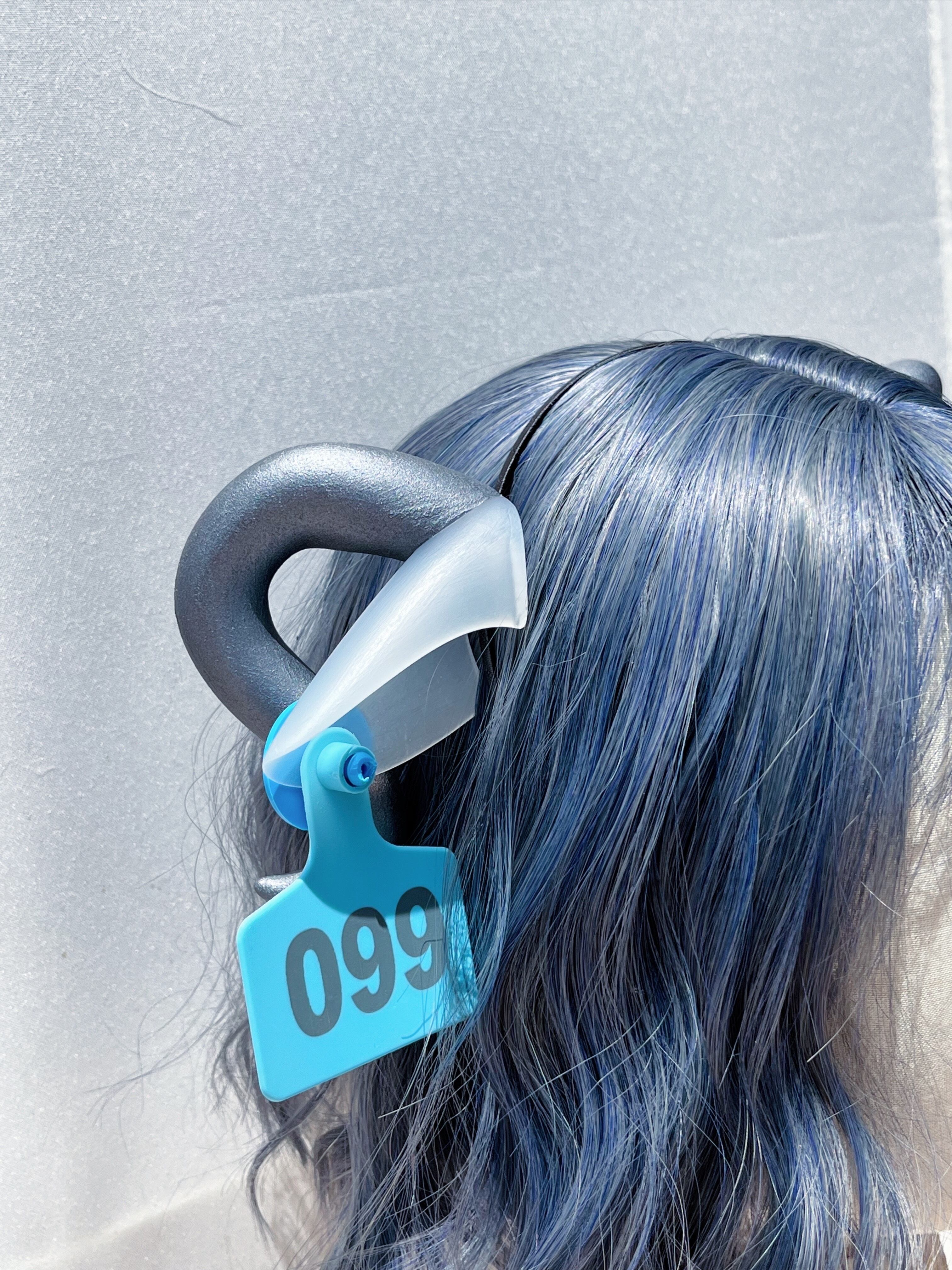 出荷されちゃう悪魔のカチューシャ 白いお耳×銀のツノ×水色のタグ