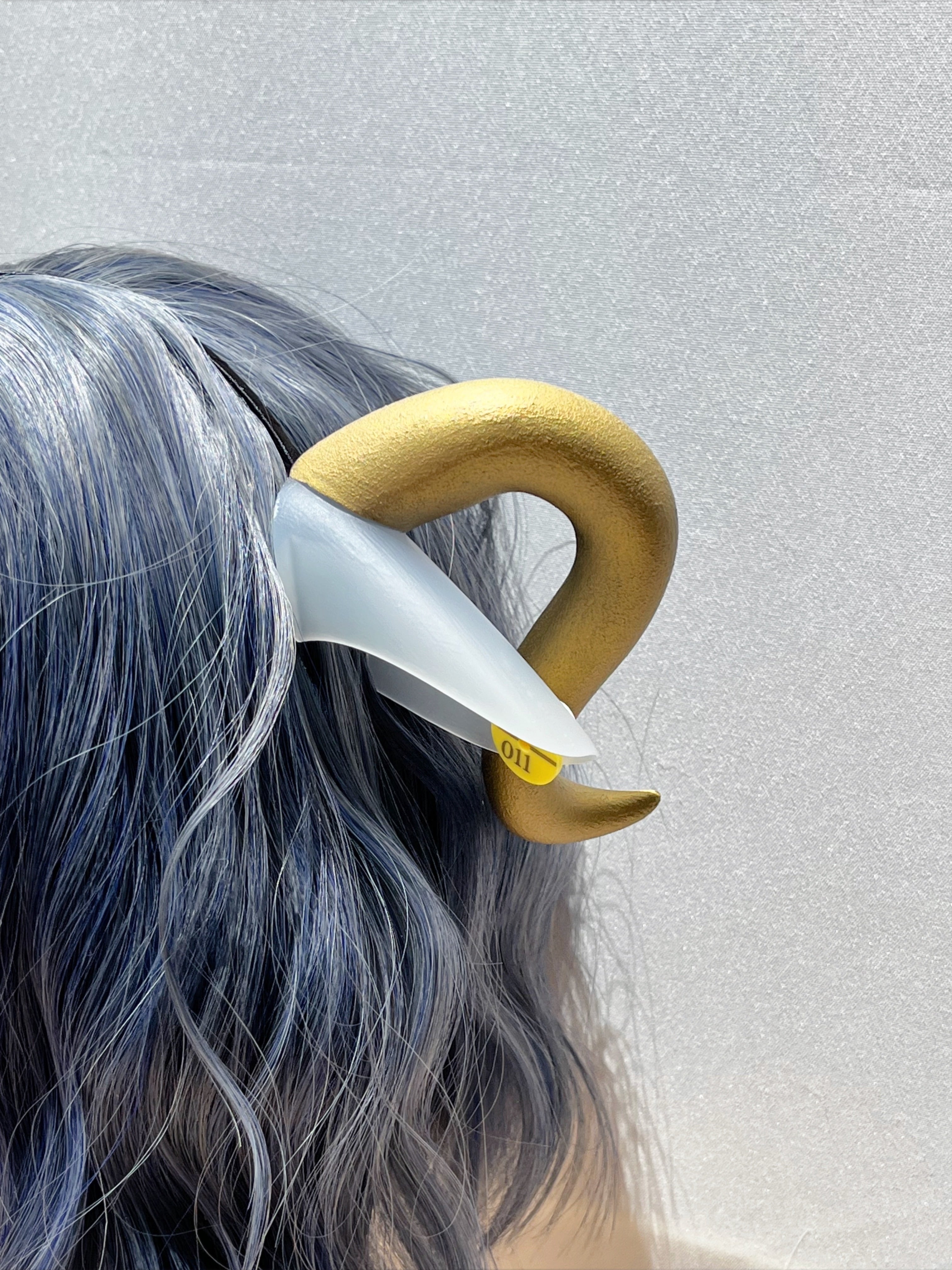 出荷されちゃう悪魔のカチューシャ 白いお耳×金のツノ×ピンクと黄色のタグ