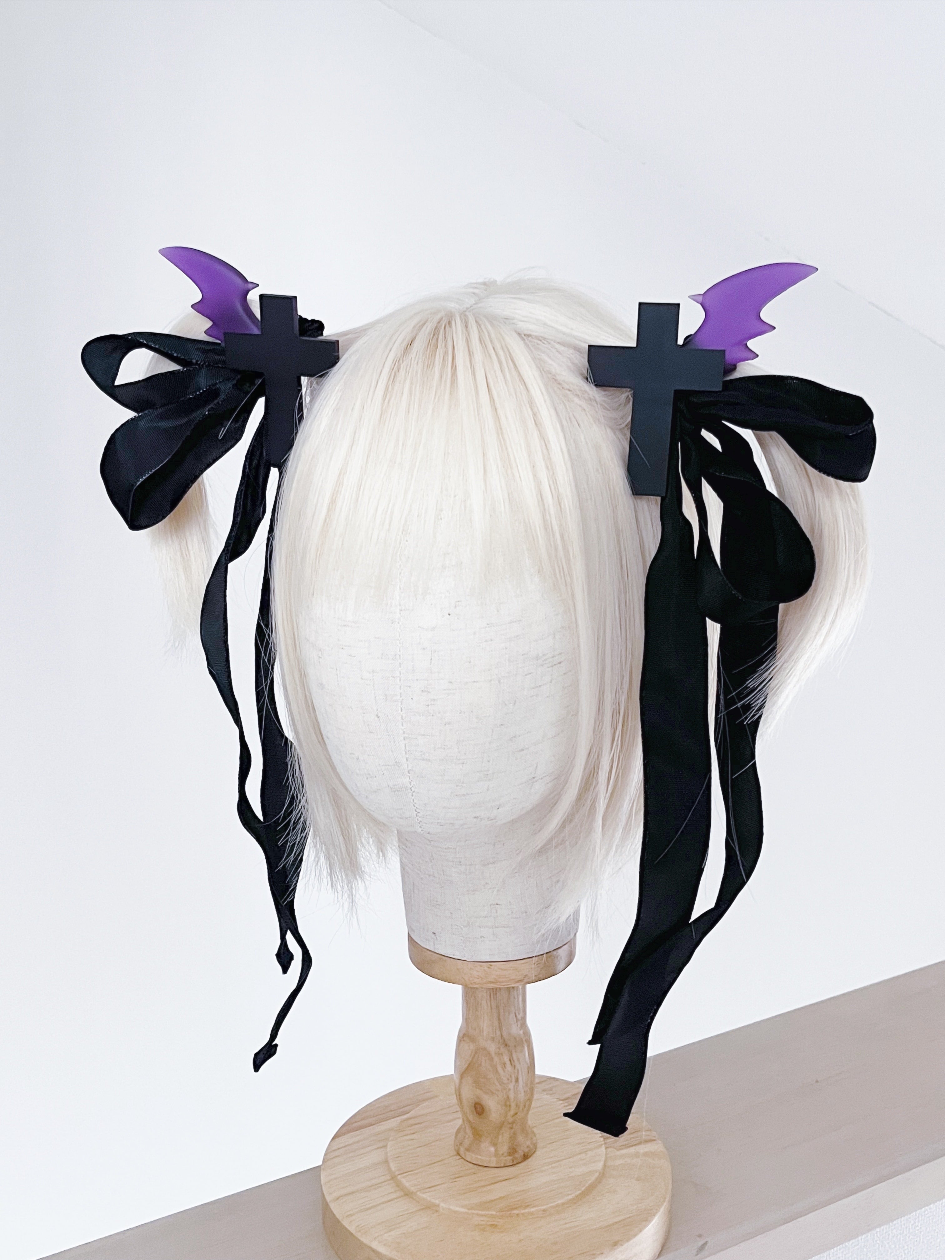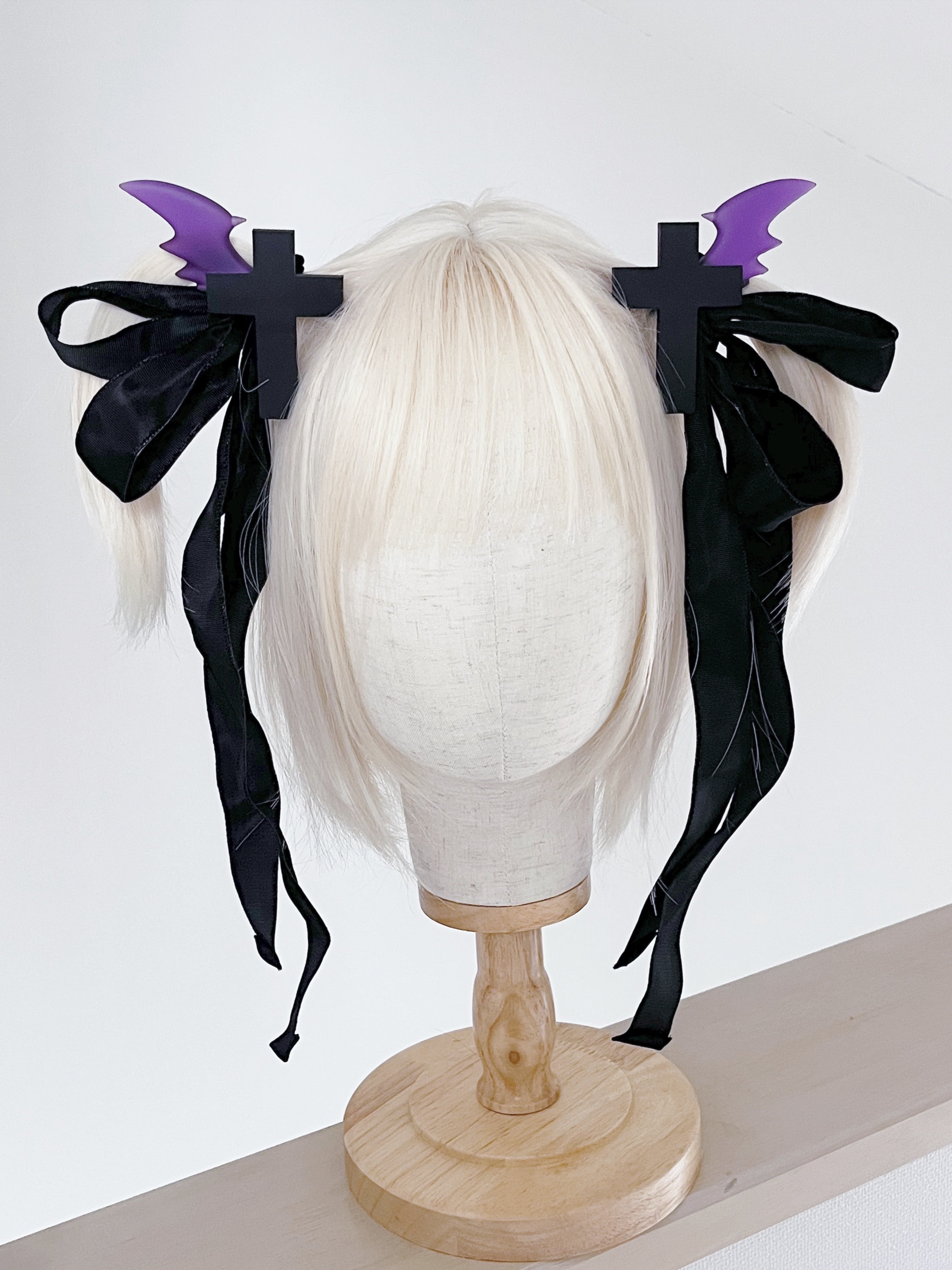 あの頃の小悪魔ヒロインヘアゴム 黒い十字架×紫の羽×黒いリボン