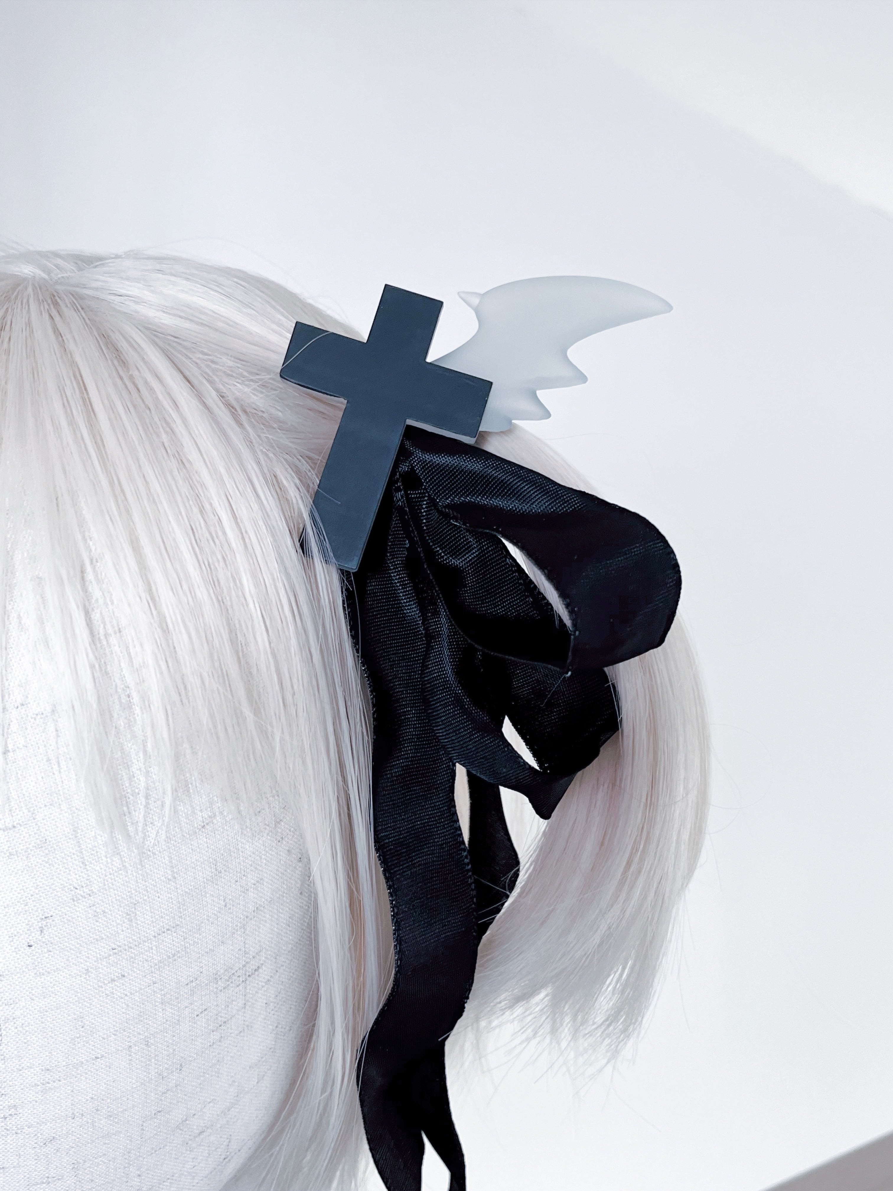 あの頃の小悪魔ヒロインヘアゴム 黒い十字架×白い羽×黒いリボン