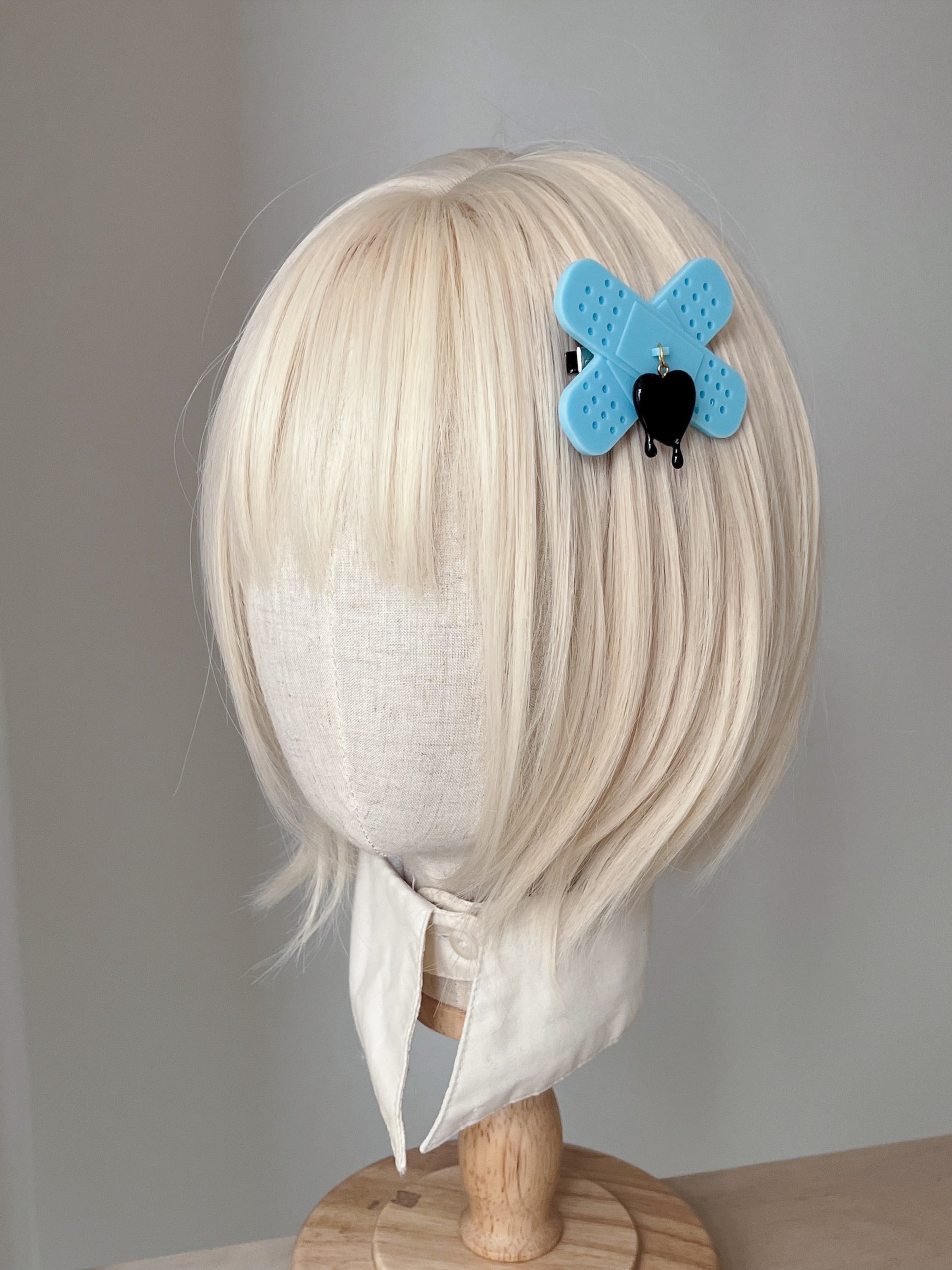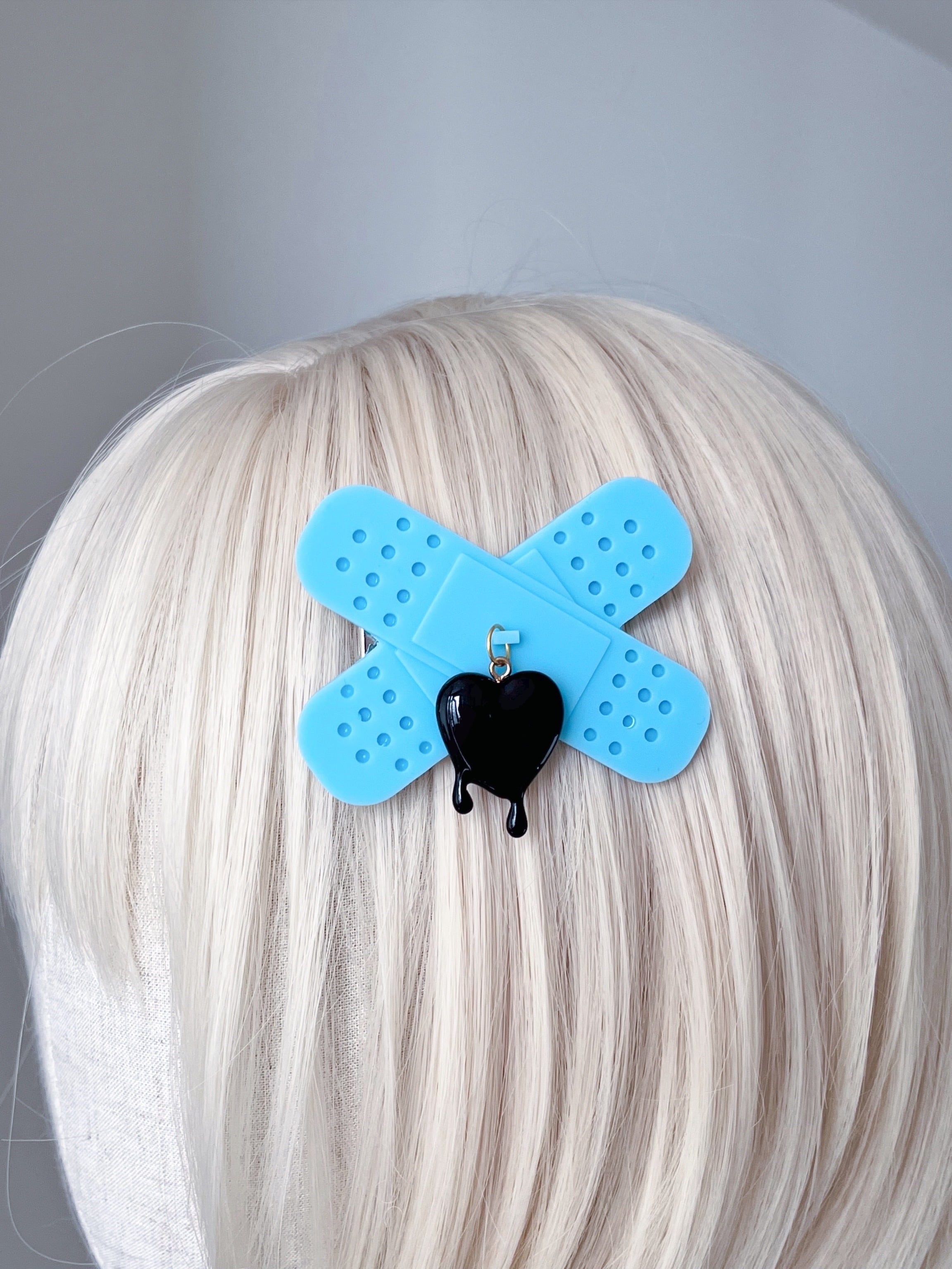 絆創膏ヘアクリップ 水色×黒いハート